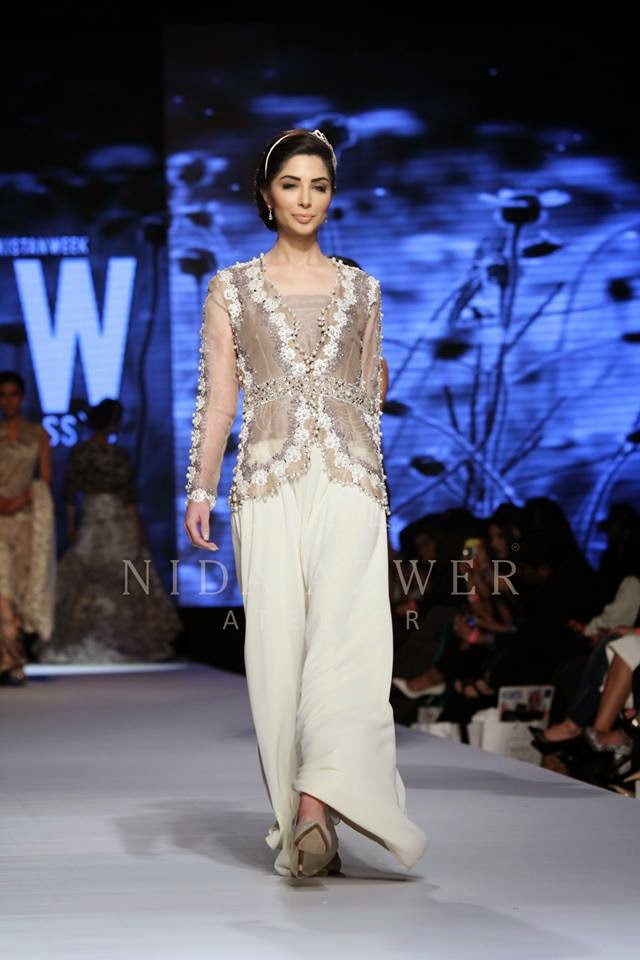 Nida Azwer Atelier has launched its most freshly ready to wear French Trellis summer collection 2015 on the catwalk of Telenor Fashion Pakistan Week 2015 at pearl continental hotel in Karachi. There are top Pakistani fashion designers introduced their latest summer collections, luxury pret collections, casual wear for both men and women as well, Nida Azwer brand is also launched French Trellis summer collection 2015. Attractive persona such as Mehreen Danish, Faiza Lakhani, and Noor Tarin wears, Saima Rizvi and Nida Azwer French Trellis summer Collection 2015. Nida Azwer has designed theses French Trellis summer collection 2015 with beautiful embroidered and designed motifs and thread work finished on the chiffon, and high quality silk fabrics.The French Trellis summer collection 2015 has consist one shade of grey, off-whites, beige and pink and is decorated with beautiful embroideries, pearls and crystals. The French Trellis summer collection dreadful to attraction us as of the rambling styling design and the tedious flowery design it platform. It featured floral design completed on a gorgeous collection of fabrics like silk and organza. “French Trellis summer Collection 2015”, designer has designed with digital embroidery, digital prints, hand embroideries, creative cuts and decoration. Hope you will like all the beautiful images of French Trellis Summer Collection 2015 at TFPW.